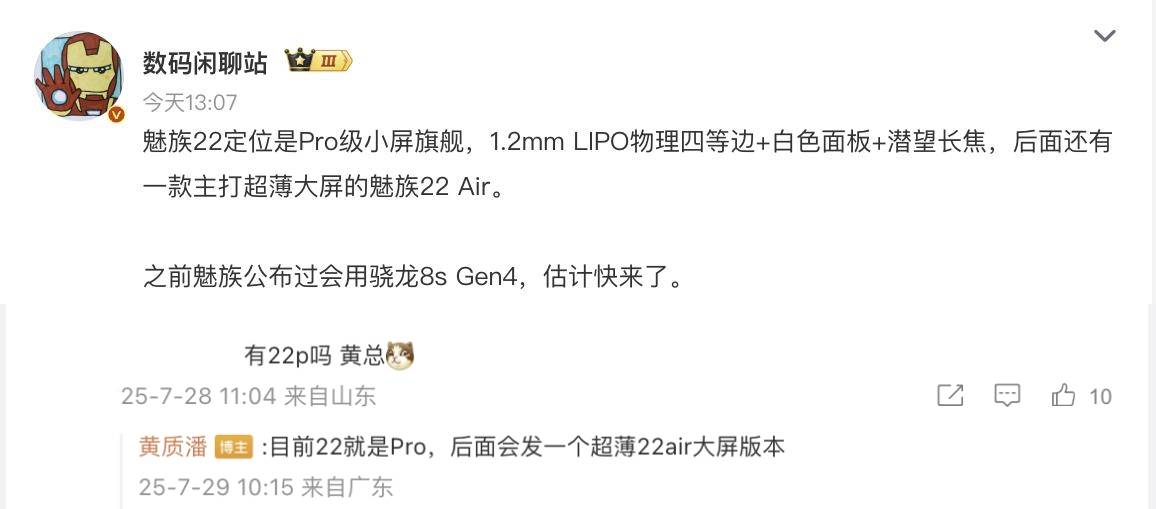 影像方面有惊喜,这是首款支持潜望式长焦的魅族手机,官方的解读是表现媲美Ultra级别的长焦,亓纪的建议是不要报太高的期待。第二款机型是魅族22 Air,该机主打轻薄和大屏,和魅族22属于两个不同的方向。魅族22Air搭载第四代骁龙8s,定位和价格会稍低一些,发布时间比魅族22更靠后。