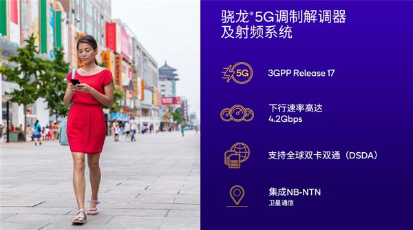 网络连接方面,第四代骁龙7集成的5G基带和视频系统支持最新的3GPP Release 17 5G标准,峰值下行速率可达4.2Gbps,支持全球双卡双通(DSDA)、NB-NTN卫星通信。